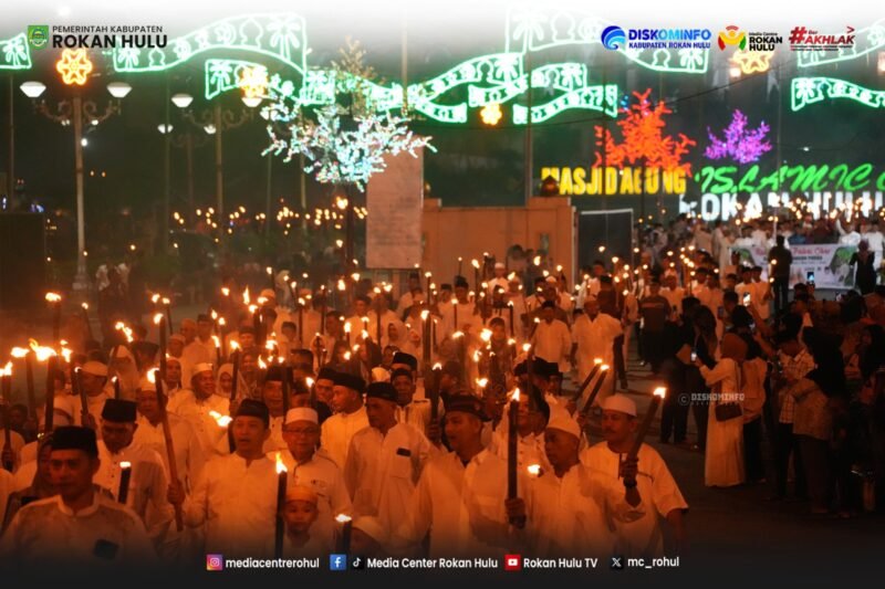 Rohul | Malam itu, Jumat (20/3/2026) langit di atas Masjid Agung Madani Islamic Center Rokan Hulu tidak hanya dihiasi bintang. Ribuan lidah api dari obor yang dibawa warga perlahan membelah kegelapan, menciptakan pemandangan serupa sungai cahaya yang mengalir tenang namun penuh energi.