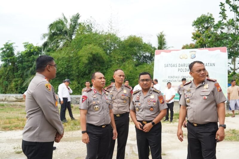 KAMPAR – Dansat Brimob Polda Riau Kombes Pol I Ketut Gede Adi Wibawa,S.I.K., dampingi Kapolda Riau Irjen Pol. Dr. Herry Herjawan, S.I.K., M.H., M.Hum. dalam peninjauan Jembatan Gobah yang baru selesai direnovasi di Dusun I, Desa Gobah, Kecamatan Tambang, Kabupaten Kampar, Senin (23/2/2026).