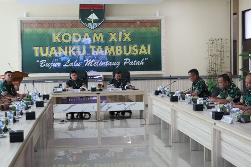 PEKANBARU || Panglima Komando Daerah Militer XIX/Tuanku Tambusai, Mayjen TNI Dr. Agus Hadi Waluyo, S.A.P., M.M., CHRMP., memimpin langsung rapat darurat melalui paparan konsep operasi terpadu penanganan kebakaran hutan dan lahan (Karhutla) yang berlangsung di Ruang Yudha Makodam XIX/Tuanku Tambusai.Kamis 9/4/26.