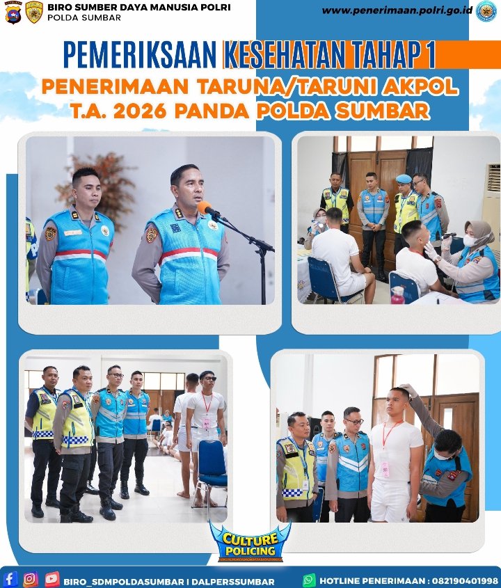 Padang – Pelaksanaan Pemeriksaan Kesehatan (Rikkes) Tahap I dalam rangka penerimaan Taruna/i Akademi Kepolisian (Akpol) Tahun Anggaran 2026 Panda Polda Sumatera Barat berlangsung lancar dan tertib, Jumat (10/4/2026).