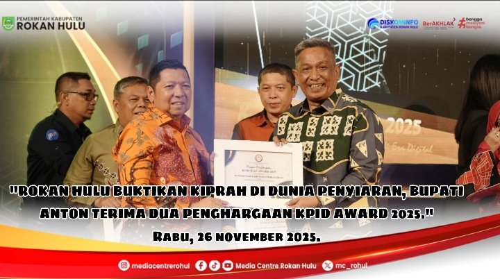 Pekanbaru – Menjelang berakhirnya tahun 2025, sebuah kabar membanggakan kembali datang untuk Kabupaten Rokan Hulu (Rohul). Dalam ajang KPID Riau Award 2025, Rohul berhasil mencatat prestasi membanggakan melalui dua penghargaan yang diberikan kepada Bupati Rokan Hulu, Anton, ST, MM. Penghargaan tersebut diterima langsung pada malam penganugerahan yang berlangsung di Pekanbaru, Rabu (26/11/2025).