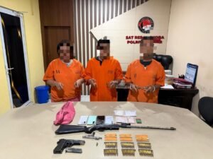 Dari penangkapan para pelaku ini berhasil kita sita barang bukti 13 paket sabu-sabu yang dibungkus dengan plastik klip, berat kotor : 106.14 Gram, Handphone, tas warna pink, senjata Api Laras Panjang jenis senapan rakitan pada kamar senpi terisi 1 butir amunisi, senjata api laras pendek Rakitan jenis FN berikut magazen berisikan 1 butir Amunisi kaliber 6 mm, 58 butir Amunisi kaliber 5,56X45 mm dan 3 kota amunisi. “Ketiganya kita jerat Pasal 114 ayat (2) UU No.35 Tahun 2009 tentang Narkotika dan/atau Pasal 609 ayat (2) huruf a UU No. 1 tahun 2023 tentang KUHP dan/atau Pasal 609 ayat (2) huruf a UU No. 1 tahun 2026 tentang penyesuaian pidana,”tegas AKP Markus.