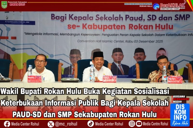 Rohul — Pemerintah Kabupaten Rokan Hulu (Rohul) memperkuat komitmen terhadap transparansi publik di sektor pendidikan melalui Sosialisasi Keterbukaan Informasi Publik bagi Kepala Sekolah PAUD, SD, dan SMP se-Rohul. Kegiatan vital ini diselenggarakan di Hall Islamic Center Pasir Pengaraian pada Rabu, 3 Desember 2025.